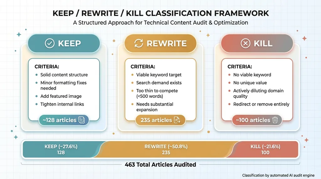 This is why the KILL tier matters as much as the REWRITE tier. Some articles shouldn't be saved. They should be redirected or removed entirely. Keeping a 400-word article that targets a keyword with zero search volume isn't preserving content — it's preserving a liability.