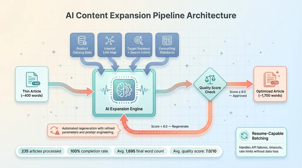 Each article was rebuilt, not padded. The expansion pipeline had context that a generic AI rewrite would never have: the client's full product catalog, the site's internal linking map, the target keyword for each article, and a formatting standard that every piece had to conform to.