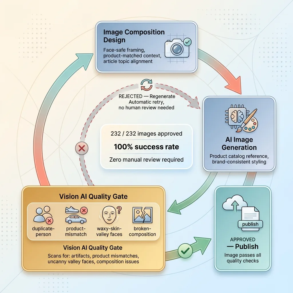 The solution was a multi-stage quality loop. First, compositions were designed to be face-safe — framing and angles that avoided close-up faces where AI still struggles most. Second, each generated image was matched against the product catalog to ensure the depicted products were accurate. Third — the critical piece — a Vision AI gate audited every single image for artifacts before approval.