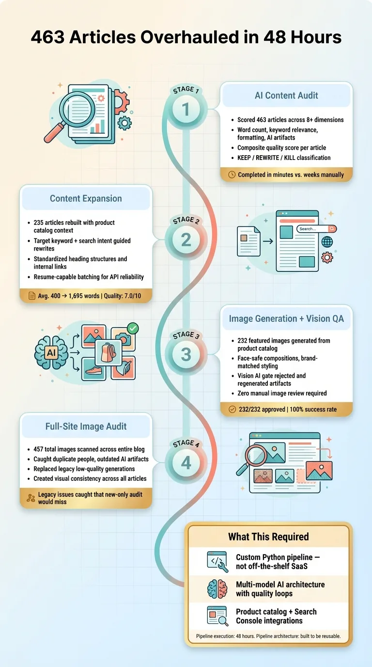 AI content optimization at scale: how I audited, rewrote, and generated images for 463 blog articles in 48 hours. Real numbers, real pipeline, real results.