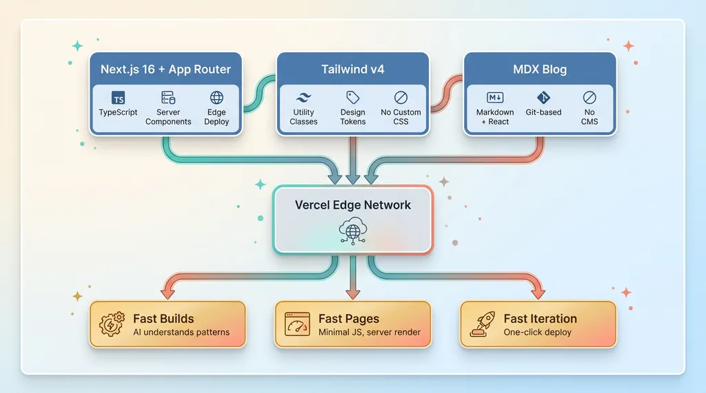 Next.js 16 with App Router is the foundation. It's production-ready, SEO-friendly out of the box, and deploys to Vercel's edge network in one click. The App Router gives me a clean file-based routing structure where every folder becomes a URL path. AI tools like Cursor understand this pattern because it's well-documented and consistent.