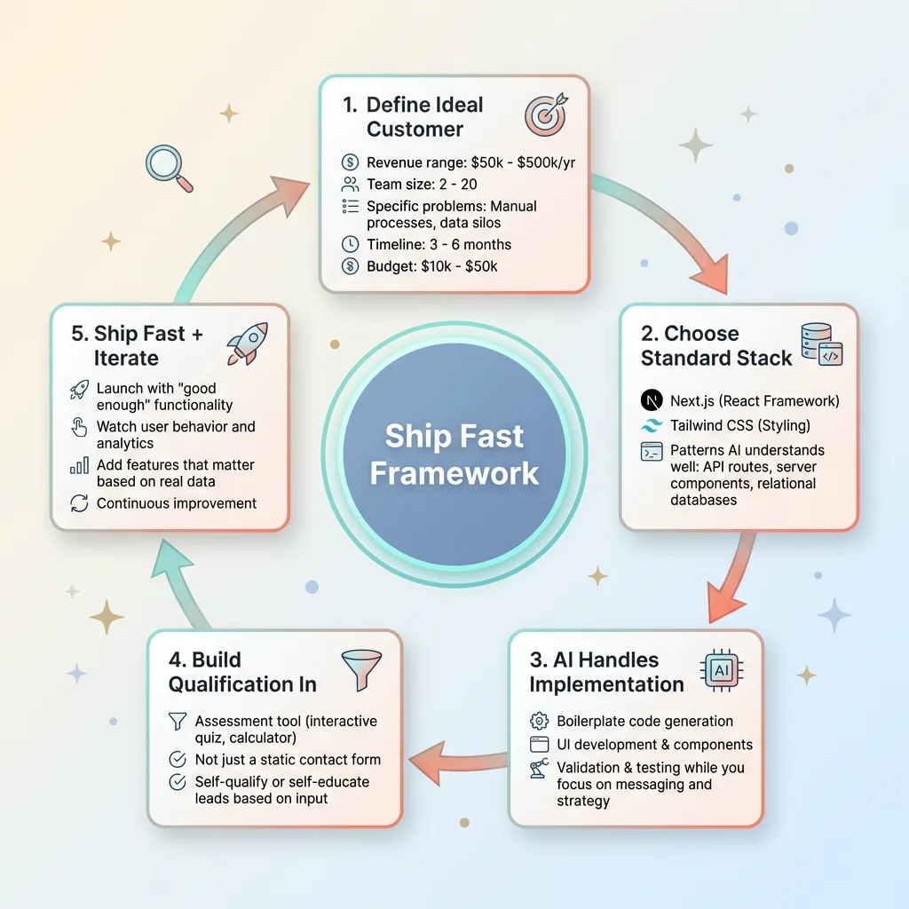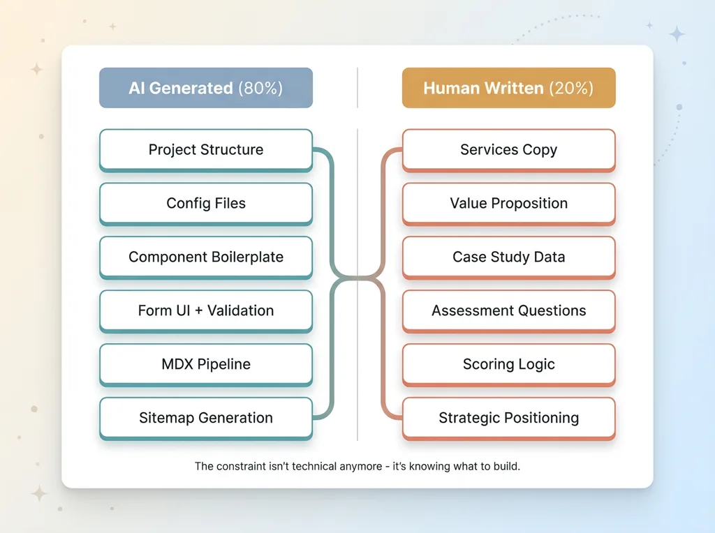 Third, let AI handle implementation while you focus on messaging. AI writes the form validation, the API routes, the responsive layouts. You write the value proposition, the case studies, the qualification criteria.