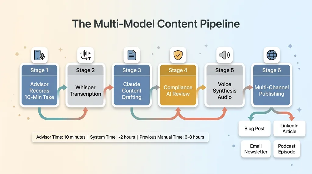 Whisper handles transcription. Claude handles content drafting because it's significantly better at nuance and tone matching than alternatives I've tested. A separate voice synthesis model produces polished audio versions of the written content — essentially creating podcast episodes from blog posts. The advisor records a rough, off-the-cuff take in their car. The system produces a polished article that sounds like them and a studio-quality audio version they can embed on their website or distribute as a podcast.