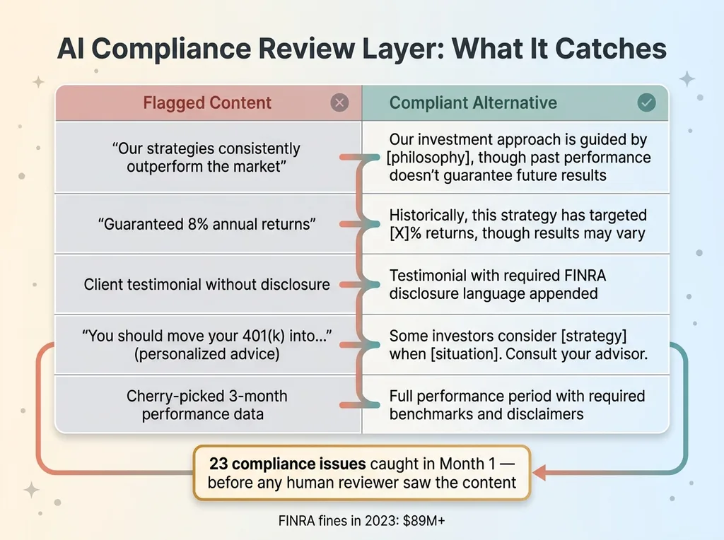 The compliance review layer is non-negotiable. Every single piece of generated content passes through a compliance-focused AI review that checks for specific regulatory red flags before any human sees it.