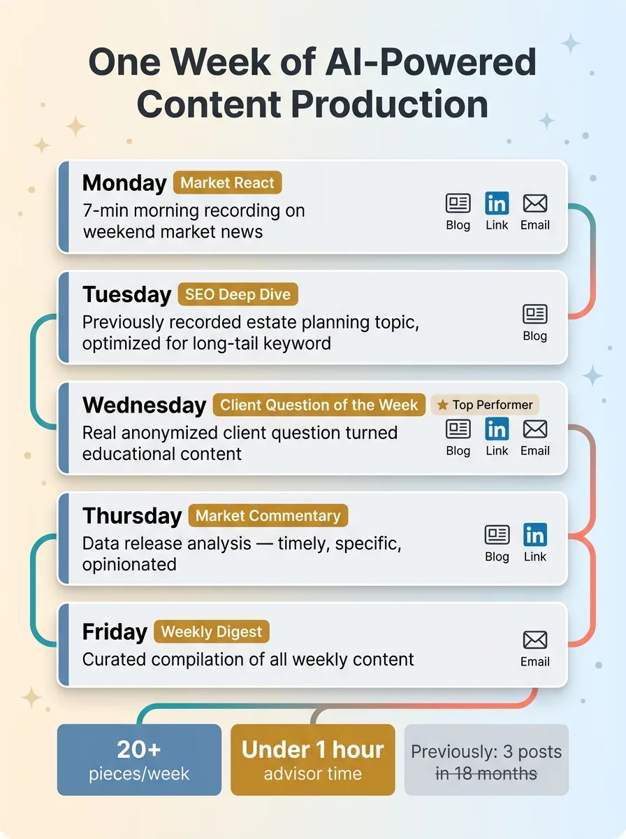 The firm went from 3 blog posts in 18 months to 20+ pieces of content per week. The advisor's total weekly time commitment: under 1 hour.