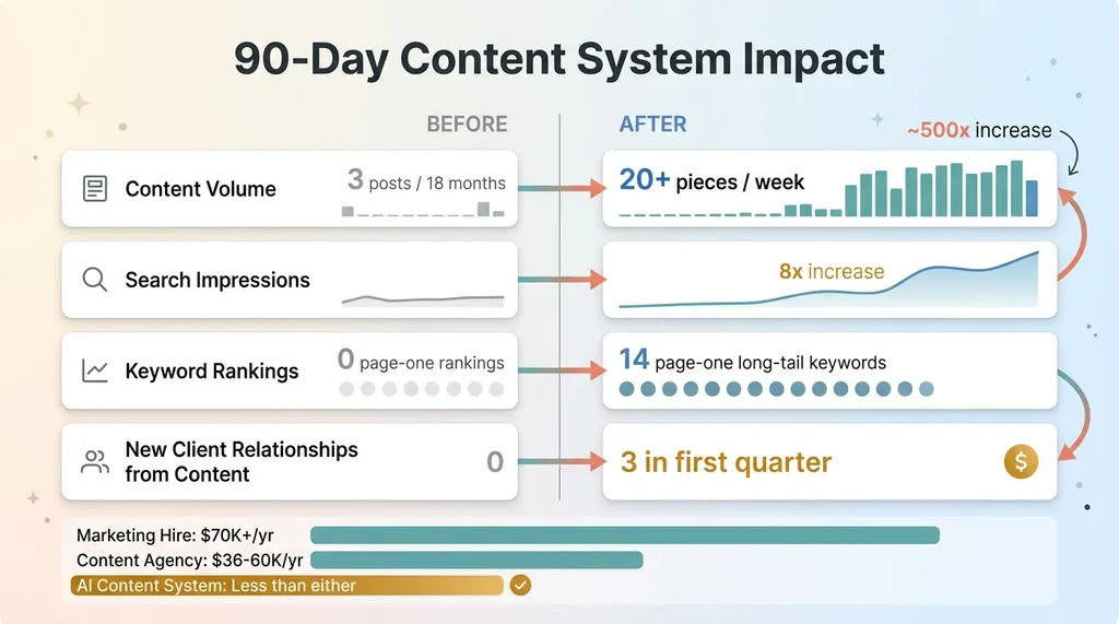 After 90 days, organic search impressions increased roughly 8x. The firm started ranking on page one for 14 long-tail keywords they'd never appeared for. Email open rates held steady at 34% — notable because volume increased dramatically and open rates usually tank when you email more frequently. LinkedIn engagement tripled.