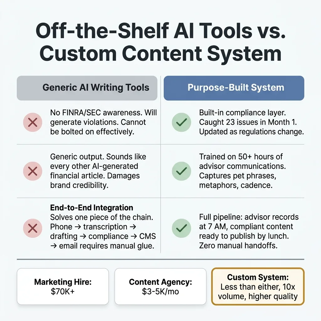 Integration. The recording-to-publishing pipeline connects the advisor's phone to a transcription service to a content engine to a compliance check to a CMS to an email platform. Off-the-shelf tools solve one piece of that chain. The value is in the connected system — the fact that an advisor talks into their phone at 7 AM and compliant, on-brand content is ready to publish by lunch.