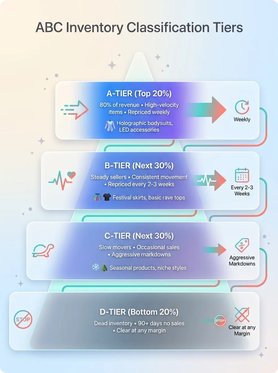 A-tier products (top 20%): High-velocity items that generate 80% of revenue. These are our bestsellers — holographic bodysuits, LED accessories, popular festival fashion styles. They get repriced weekly based on inventory velocity and demand signals.