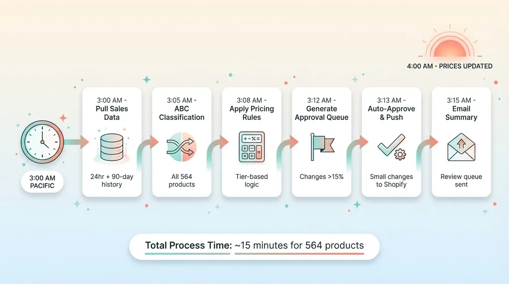 This isn't a Shopify app. It's not a SaaS subscription. It's custom Python that runs at 3 AM every night, classifies products into tiers, applies pricing rules, and flags anything weird for human review.