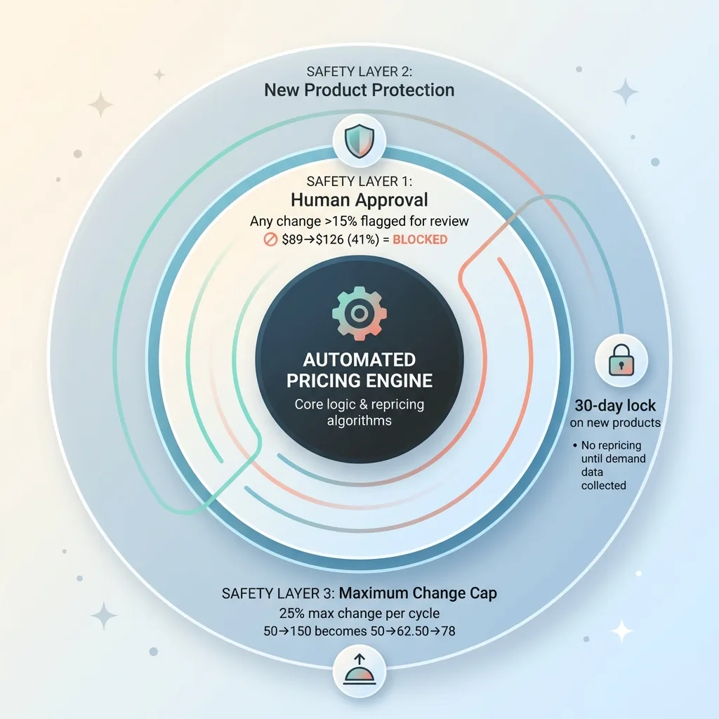 Zero pricing disasters. No $12-instead-of-$120 errors. No products accidentally marked down 90%. No angry customers emailing about price gouging. The safety systems work.