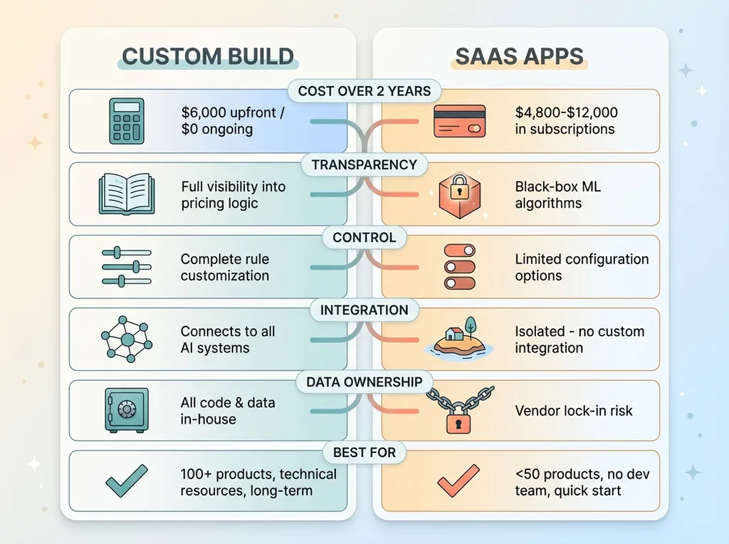 Limited integration with other AI systems. Our pricing system shares data with our product creation pipeline, SEO automation, and inventory forecasting. A SaaS app lives in isolation — it doesn't talk to the rest of our AI infrastructure.