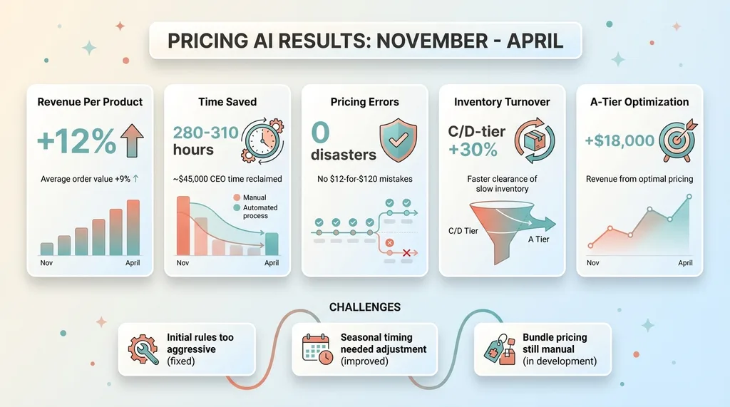 Inventory turnover improved for C and D-tier products. We're clearing slow inventory 30% faster because the system is more aggressive with markdowns than I was manually. I hate marking products down — it feels like failure. The system doesn't have that emotional attachment.