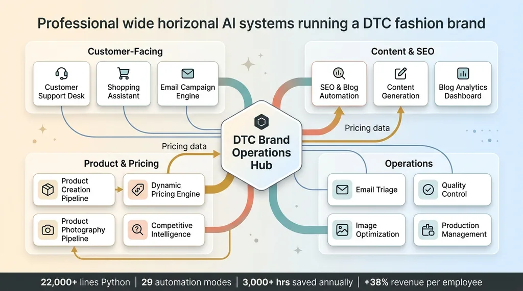 Right now, my brand runs 14 AI systems in production. Not experiments. Not proofs of concept. Systems that process real orders, write real content, and make real pricing decisions every day.