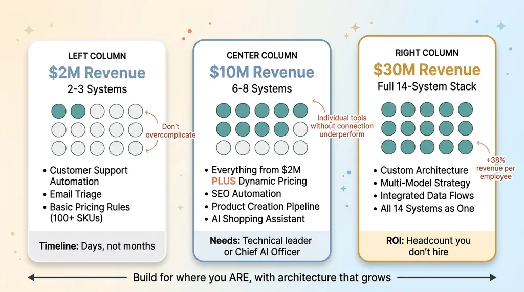 At $2M revenue: You need 2-3 systems, maximum. Customer support automation and email triage are your highest-return starting points. Maybe basic pricing rules if you have more than 100 SKUs. Total investment: one focused build sprint measured in days, not a six-month project. Don't overcomplicate this.