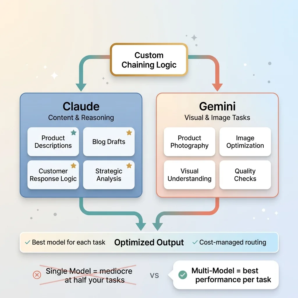 Why not just pick one? Because each model has real, measurable strengths. Claude writes better product copy. Gemini handles visual understanding better. A single-model approach means you're accepting mediocre performance on half your tasks to avoid the complexity of multi-model routing.