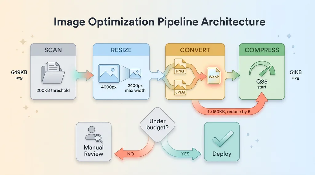 For hodgen.ai, I set a budget of 150KB per image. The pipeline starts at quality 85, saves the file, checks the output size. If it's over budget, it reduces quality by 5 and tries again. If it can't hit the budget without dropping below quality 60, it flags the image for manual review.