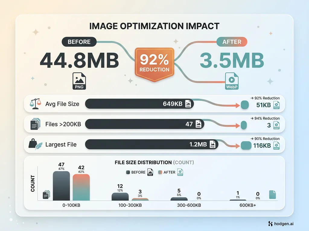 Largest individual savings: a 1.2MB hero image compressed to 116KB. A 90% reduction with no visible quality difference.
