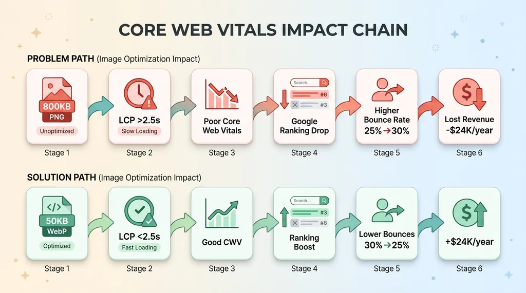 Core Web Vitals — specifically Largest Contentful Paint (LCP) and Cumulative Layout Shift (CLS) — are direct Google ranking factors. LCP measures how long it takes for the largest visible element (usually an image) to load. If your hero image is 1.2MB, your LCP is slow. Slow LCP means lower rankings.