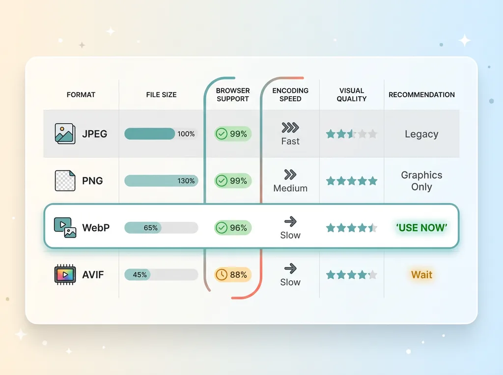 Format choice matters. I chose WebP because it's the pragmatic option in 2025.