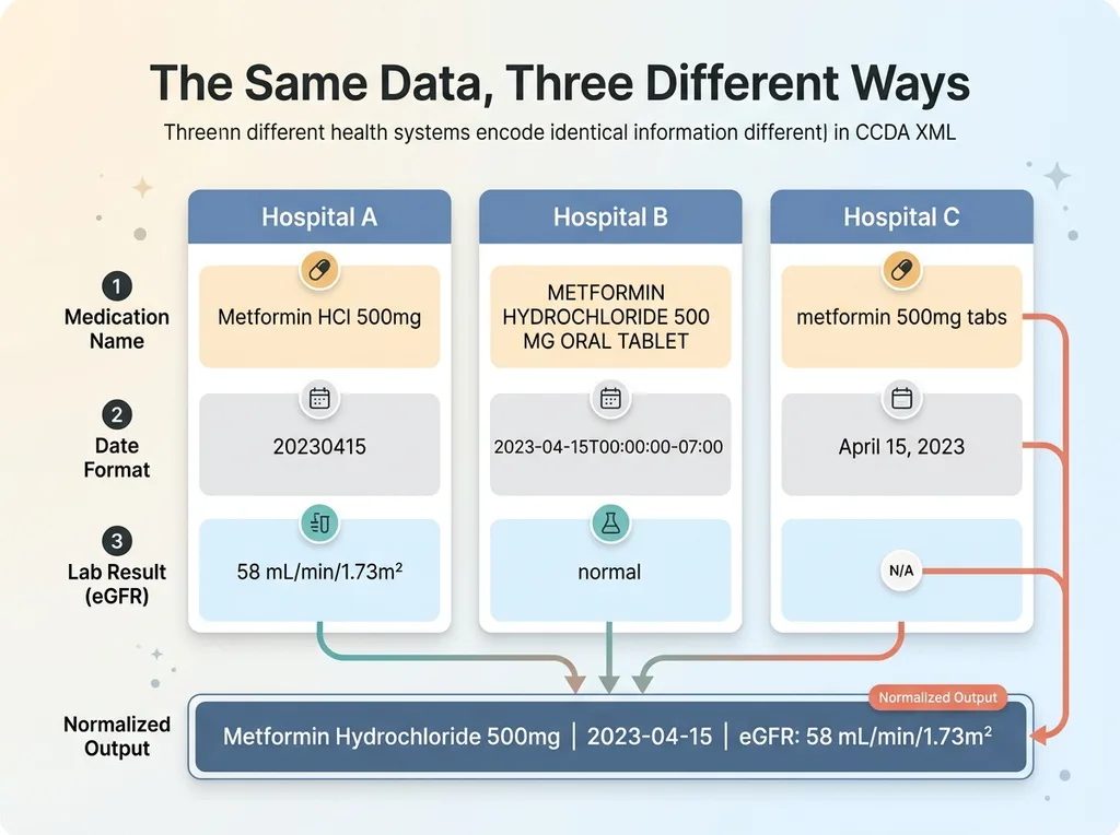 Here's what I mean by chaotic. One health system encodes dates as 20230415. Another uses 2023-04-15T00:00:00-07:00. A medication appears as "Metformin HCl 500mg" in the active medications section and as "METFORMIN HYDROCHLORIDE 500 MG ORAL TABLET" in the discharge summary. Lab results from one facility report eGFR in mL/min/1.73m² with a precise value. Another facility's CCDA just says "normal" with no numeric value at all.