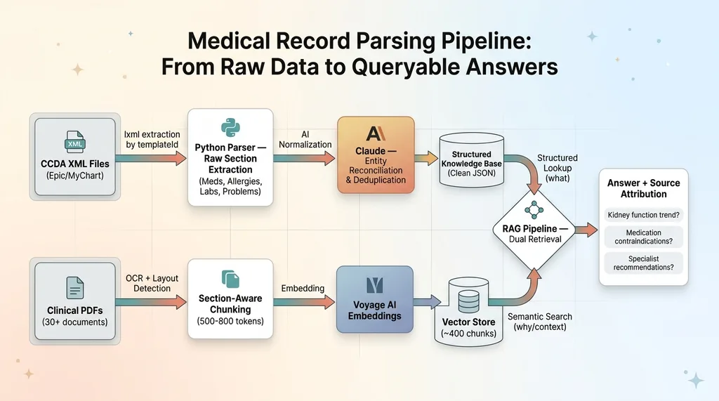 This article is a technical build log. I'm going to walk through exactly how I parsed CCDA XML files, vectorized clinical PDFs, and built a RAG pipeline that can actually answer questions about a patient's medical history. If you're dealing with messy, high-stakes data in any industry, the pattern applies well beyond healthcare.