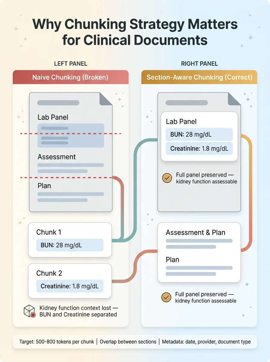The chunking strategy matters enormously for clinical documents. You can't split a lab panel across two chunks — a BUN result in one chunk and the creatinine in another makes both useless for assessing kidney function. Assessment and plan sections need to stay together. I chunk by clinical section boundaries, with overlap, targeting roughly 500-800 tokens per chunk.