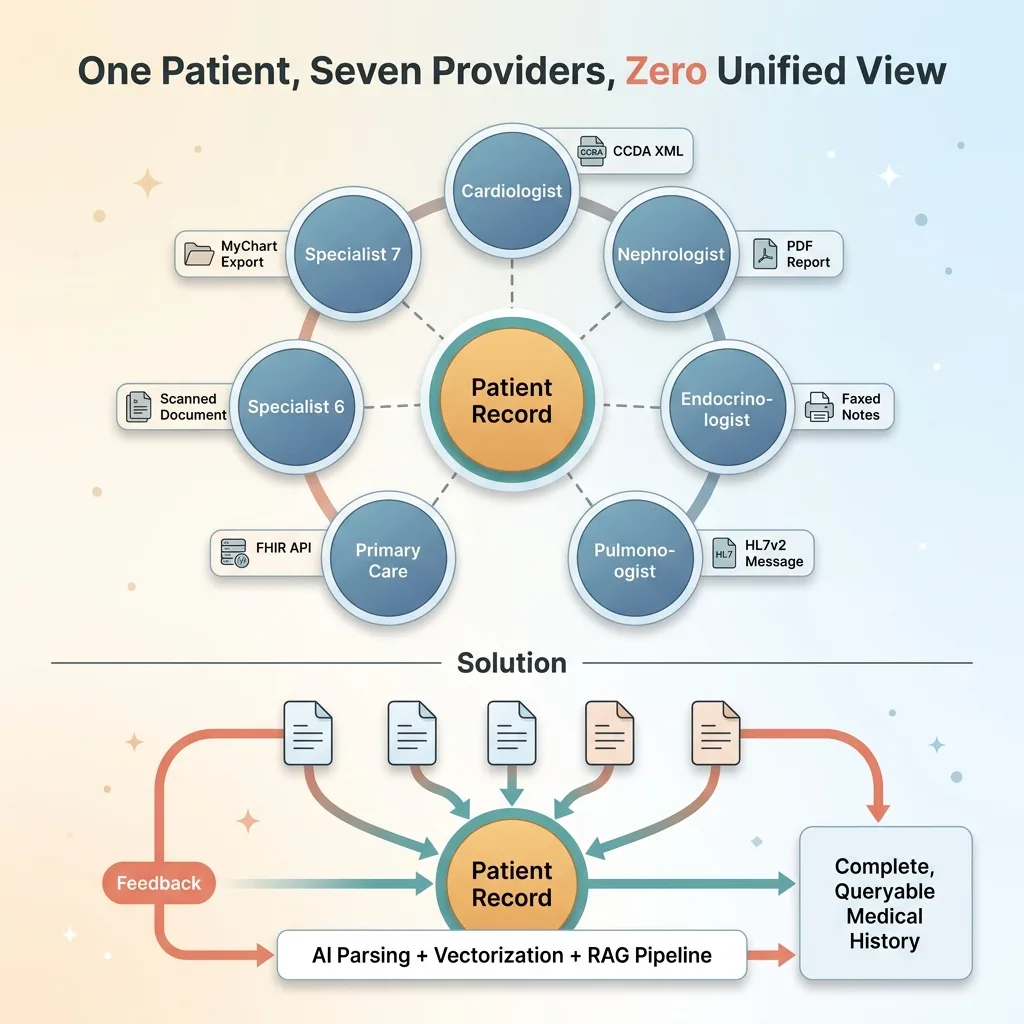 My grandmother had seven specialists. Cardiologist, nephrologist, endocrinologist, pulmonologist, primary care, and two more I'm probably forgetting. Each one operated in their own silo. Each one had fragments of her medical history, but nobody — not a single provider — had the complete picture.