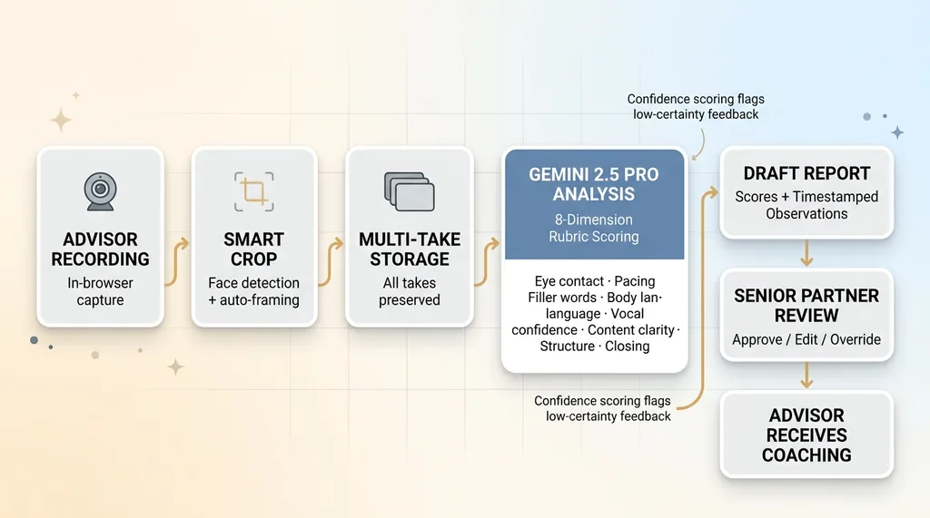 Their process was fully manual. The managing partner would sit down, watch each advisor's recordings, take notes, then deliver feedback in a one-on-one. It took hours every week. The feedback was inconsistent — sometimes detailed, sometimes a quick "looks good" because he was behind on everything else. And it created a bottleneck that meant most videos went unreviewed entirely.