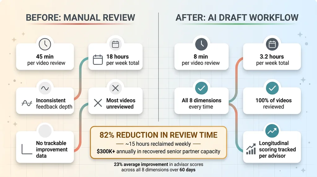 The math on time savings is striking. Twelve advisors, two recordings per week each. That's 24 videos. At 45 minutes of manual review per video, the senior partner was spending 18 hours per week just watching recordings. With the AI draft workflow, he reviews the AI's output in about 8 minutes per video. That's 3.2 hours per week.
