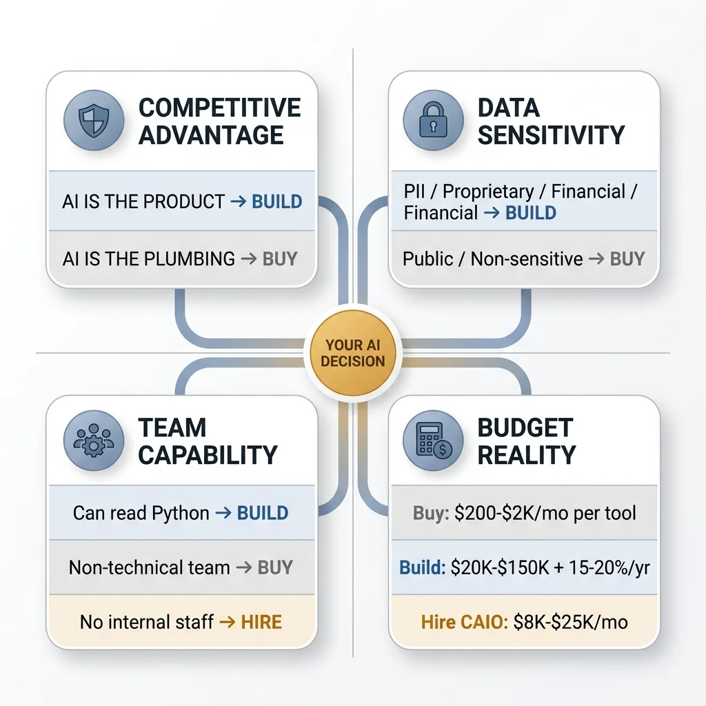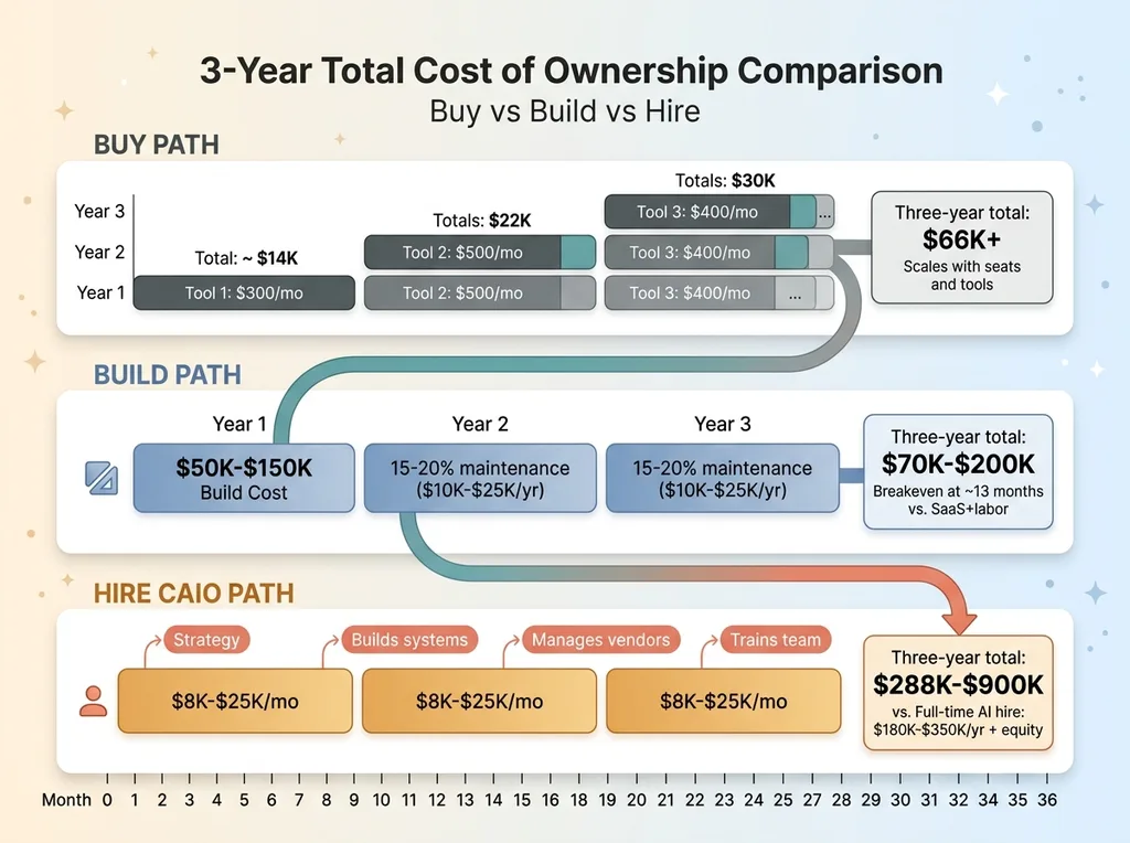 - Hire a Chief AI Officer: $8K–$25K/month. Gets you strategy, execution, and the judgment to know when to buy vs. build for each problem.