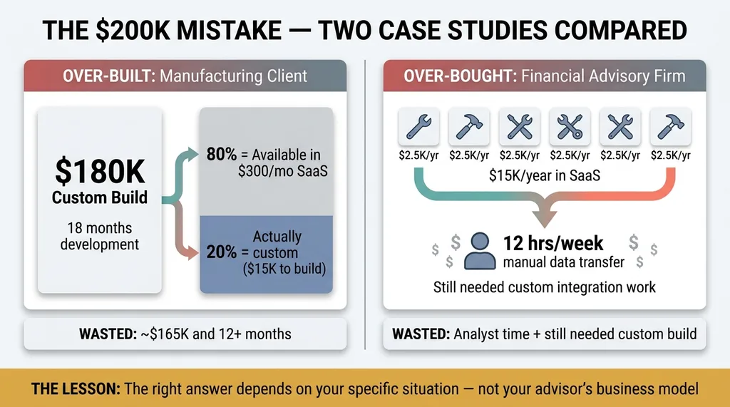 A custom manufacturing client came to me after spending $180K on a custom AI system for production scheduling. Eighteen months of development. When I audited what they'd built, about 80% of the functionality was available in a $300/month SaaS tool they'd never evaluated. The remaining 20% — the part that was actually custom to their operation — could have been built as a lightweight integration layer for maybe $15K.
