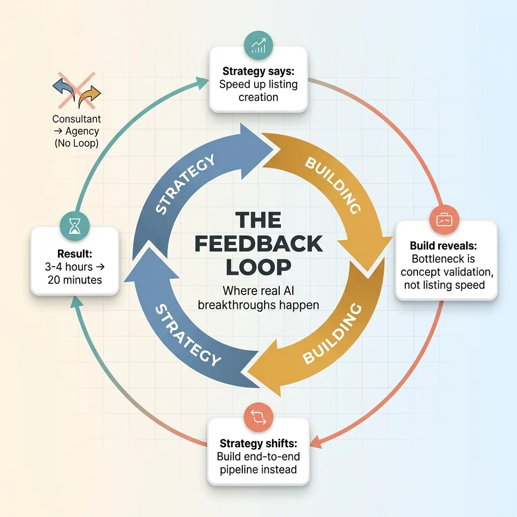Here's the feedback loop in plain terms. Strategy said "we need to reduce manual operations time." Building revealed that a 42% reduction required rethinking the workflow entirely — not just automating existing steps. You can't automate a bad process and call it progress. Building showed me which processes needed to be redesigned before they could be automated. That changed the strategy. The new strategy changed what I built next.