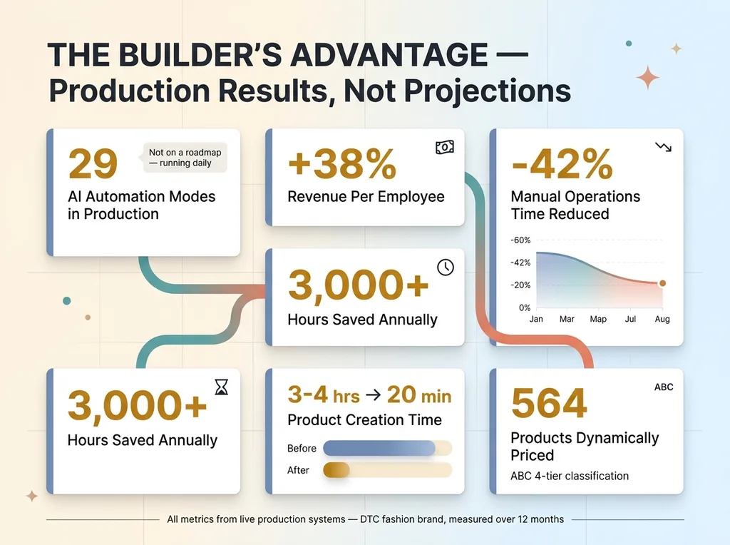 +38% revenue per employee. That metric only exists because the same person tracking business KPIs was building the systems. I knew which metrics mattered, so I built systems that moved those specific metrics.