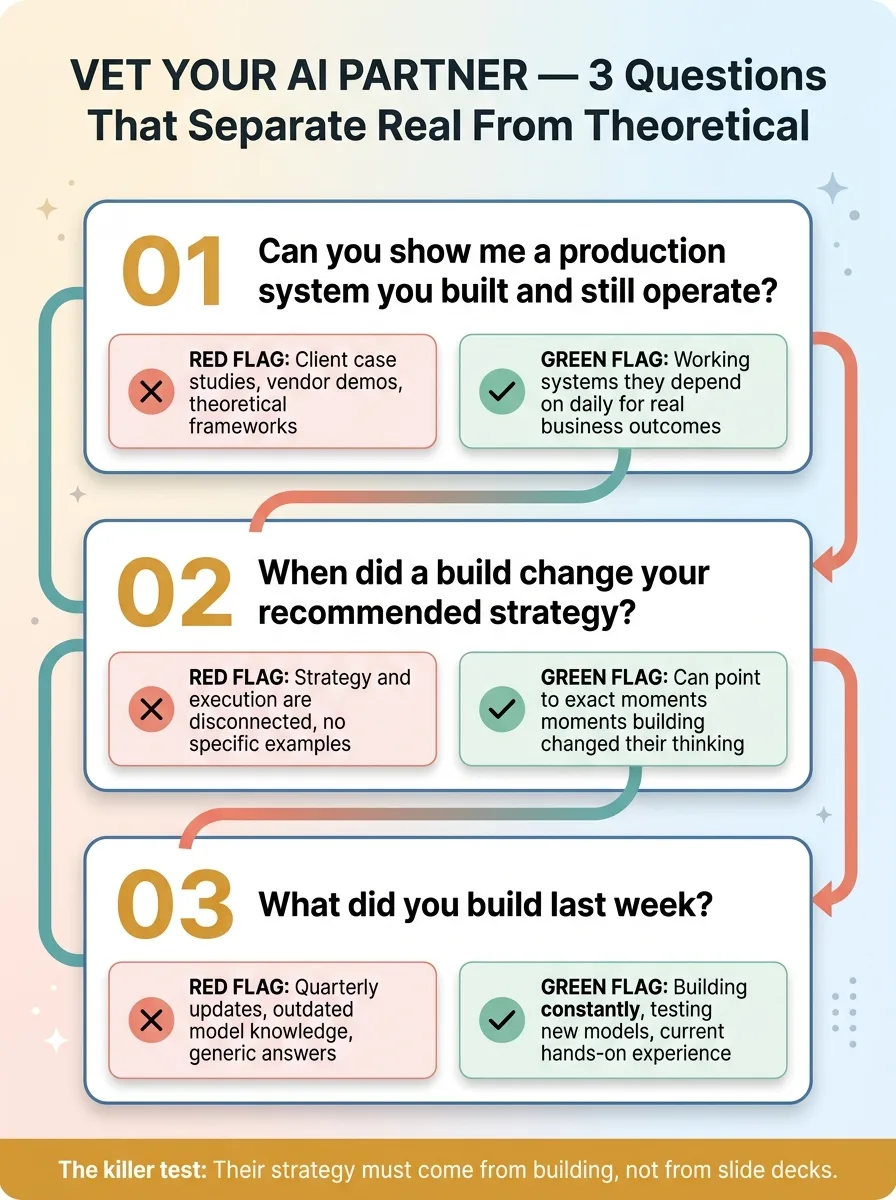 Green flags: they've shipped their own AI systems. They can show you working code. They talk openly about failures and limitations. They can start building in weeks, not months.