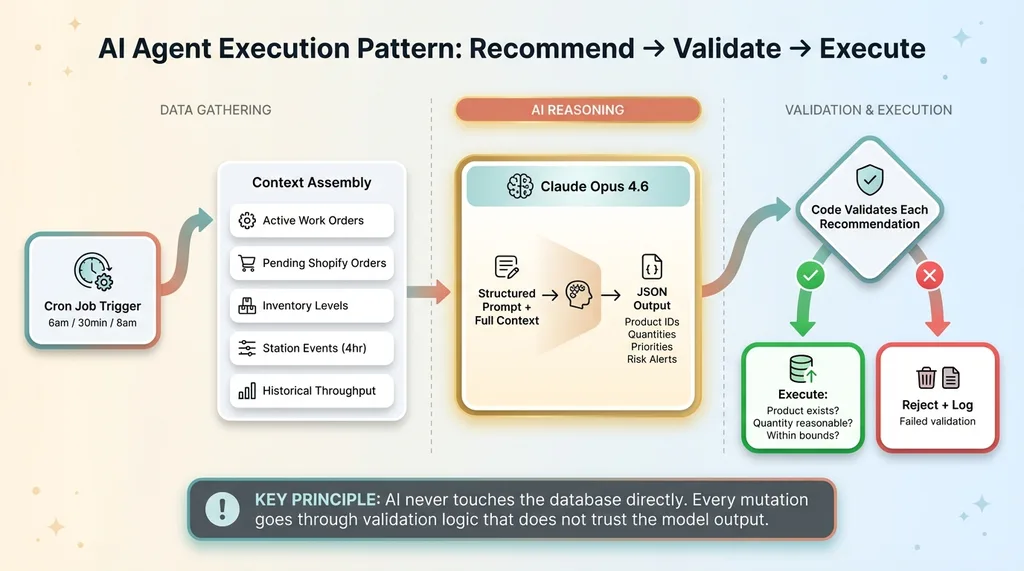 The production planner runs every morning at 6am via a Vercel cron job. It gathers every active work order, every pending Shopify order, current inventory levels, fabric stock, and historical throughput data. It feeds all of that to Claude Opus 4.6 with a structured prompt. Claude returns JSON — specific recommendations with product IDs, quantities, priorities, and risk alerts. The route handler independently validates each recommendation before executing it. If Claude recommends creating a work order, the handler verifies the product exists and the quantity is reasonable before inserting it.