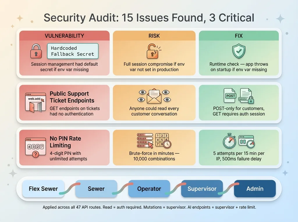 The audit found 15 issues. Three were critical. My session management had a hardcoded fallback secret that would have shipped to production if someone forgot to set an environment variable. The support ticket endpoints were fully public — meaning anyone could read every customer's conversation history, not just submit new tickets. The PIN authentication had no rate limiting — someone could brute-force a 4-digit PIN in minutes.