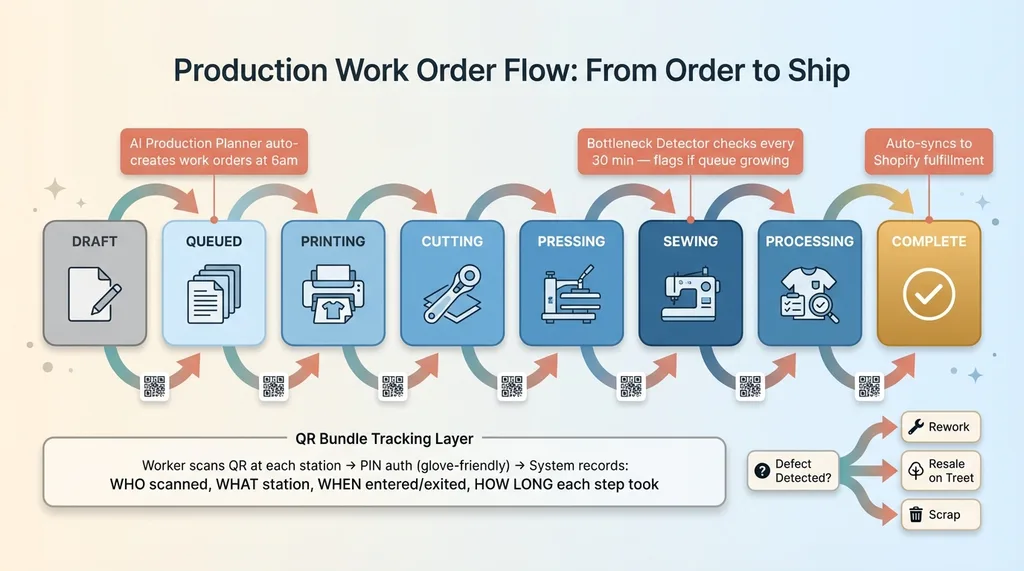 Phase 2 — Production Tracking (Replaced Tribal Knowledge). Work orders flow through a defined route: draft, queued, printing, cutting, pressing, sewing, processing, complete. Every garment bundle gets a QR code. Workers scan in at a station, complete their step, scan out. The system knows where every bundle is, how long each step took, and what's backed up.