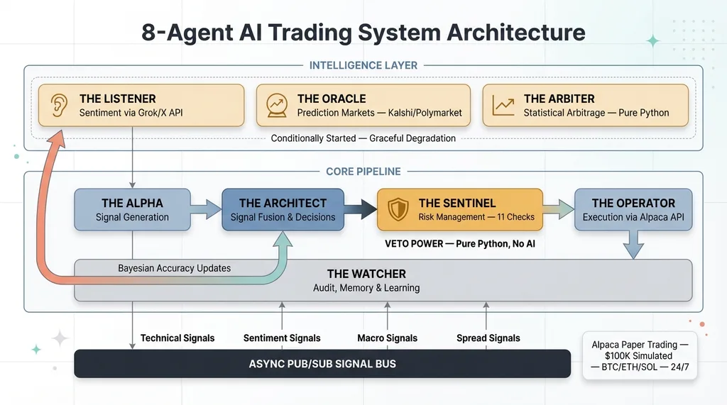Here's the setup: Alpaca paper trading account, $100k in simulated capital, trading BTC/ETH/SOL around the clock. Eight specialized AI agents coordinating through an async signal bus — five core agents handling the trading pipeline, plus three intelligence agents pulling sentiment from X, regime signals from prediction markets, and statistical arbitrage from cross-asset correlations. The system learns which of its own signals actually predict price moves using Bayesian probability. Built it. Running 24/7 since.