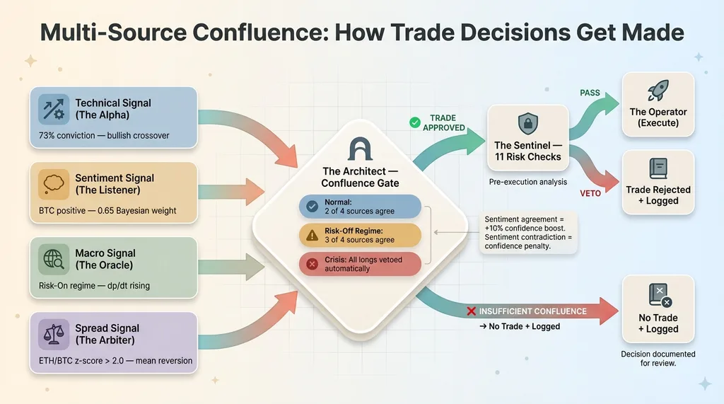 The Architect's confluence gate requires at least 2 of 4 sources (technical, sentiment, macro, spread) to agree on direction before entering a trade. During risk-off regimes from The Oracle, that threshold jumps to 3 of 4. During a crisis classification, all long entries are automatically vetoed regardless of how many sources agree.