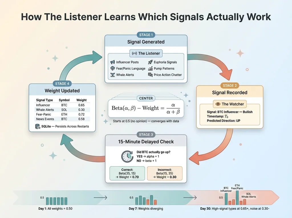 Each sentiment reading gets tagged with a sub-signal type (influencer signal, fear/panic, news event, etc.). The Watcher records what the signal predicted, then checks 15 minutes later whether the price actually moved in that direction. Those outcomes feed back into a Bayesian Beta-distribution tracker — one per signal type per symbol — that adjusts the weight of each signal over time.