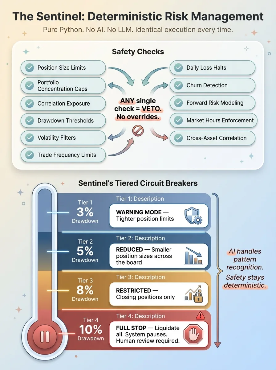 The Sentinel — risk management. Eleven independent safety checks with absolute veto power over any trade. Position limits, correlation exposure, drawdown circuits, market hours enforcement for equities, forward risk modeling — and it doesn't use a single line of AI. More on this in a moment, because the design choice here is the most important one in the entire system.