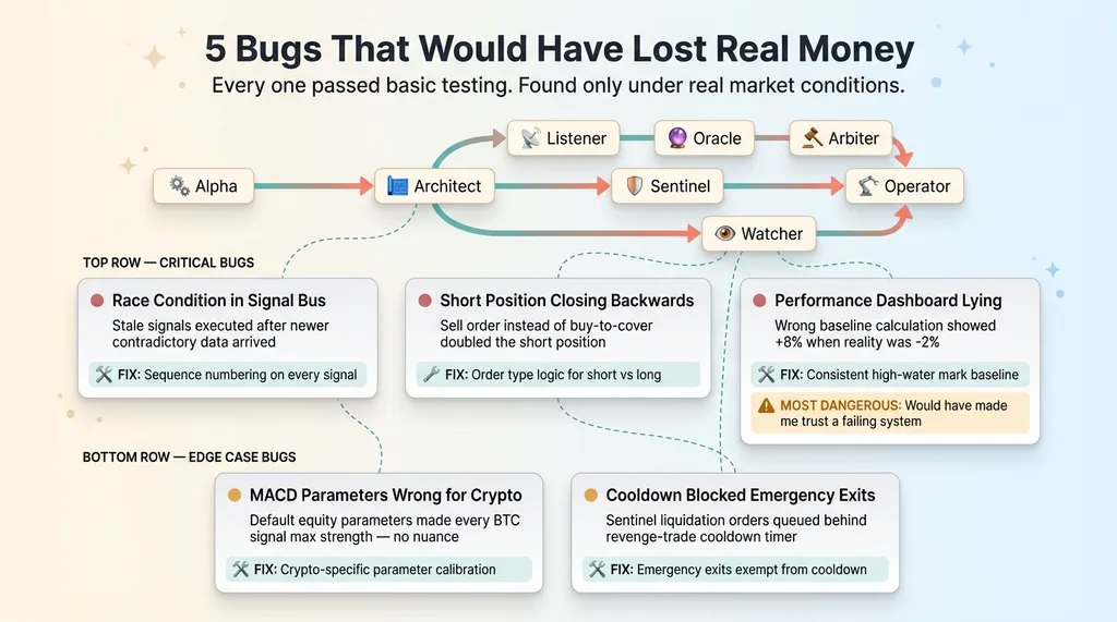 This is the section that matters most. Building the system took a few sessions. Finding the bugs that would have been invisible in a demo but devastating with real money — that's the actual work.