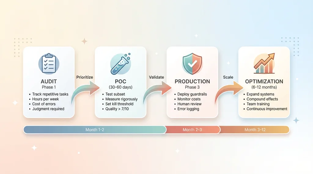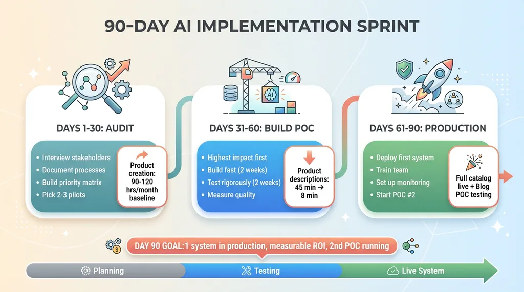 Days 61-90: Deploy first production system, start second POC. Take your successful POC to full production. Train the team, establish monitoring, set up quality checks.