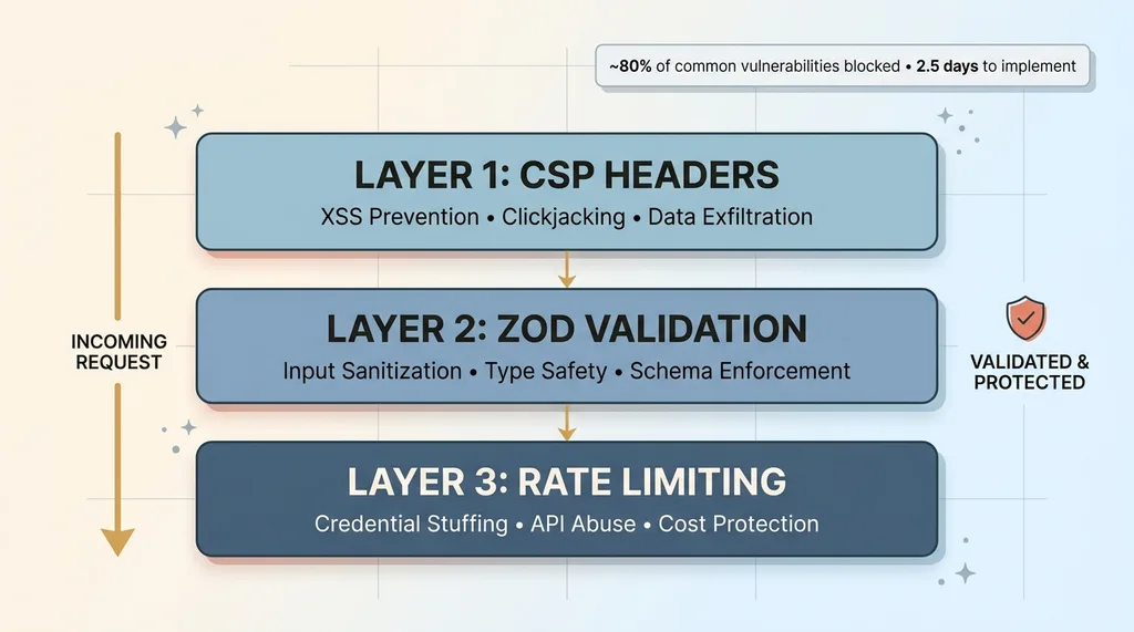 After cataloging everything, a pattern emerged. Three specific layers — CSP headers, Zod validation, and rate limiting — would have caught roughly 80% of the vulnerabilities I found. Not theoretical. Not a framework someone sold me. This is the exact web application security hardening stack I now implement on every project before it touches production.