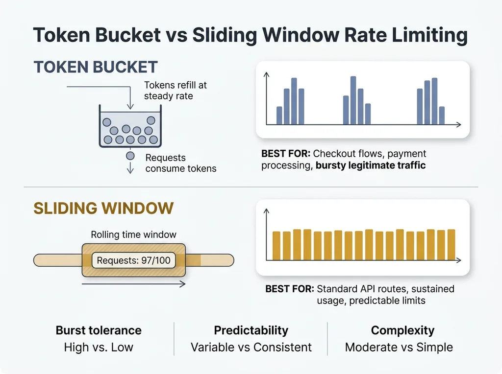 Token bucket works well for bursty traffic. Think checkout flows — a user might make several rapid requests during payment processing, and you don't want to block legitimate behavior. The bucket refills at a steady rate but allows short bursts.