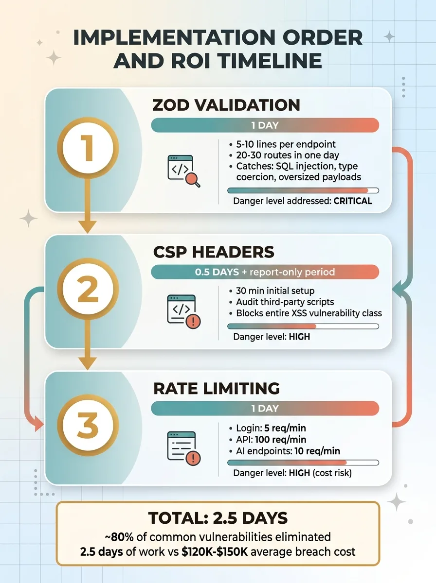 The three-layer stack I've outlined — CSP, Zod, rate limiting — is designed for exactly this situation. A small team that needs meaningful protection without a dedicated security hire. 2.5 days of work. No exotic tooling. No expensive vendors.