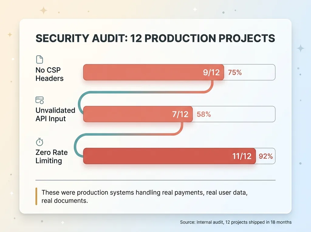 Nine out of twelve had no Content Security Policy headers. Seven had API routes accepting unvalidated input — just trusting that whatever came in matched what the frontend sent. Eleven had zero rate limiting. These weren't side projects. They were production systems handling real user data, real payments, real documents.