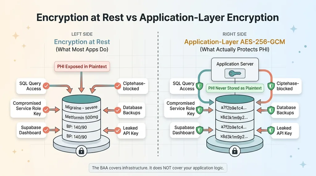 Application-layer encryption means PHI is encrypted before it touches Supabase. The database never sees plaintext health data. Not during writes. Not during reads. Not in logs. Not in backups.