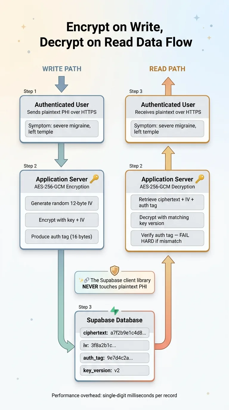 The important piece: this encryption and decryption happens in your application server. The Supabase client library never touches plaintext PHI. Your API endpoint receives plaintext from the authenticated user, encrypts it, and sends ciphertext to Supabase. On the way back, it retrieves ciphertext from Supabase, decrypts it, and sends plaintext to the authenticated user over HTTPS.