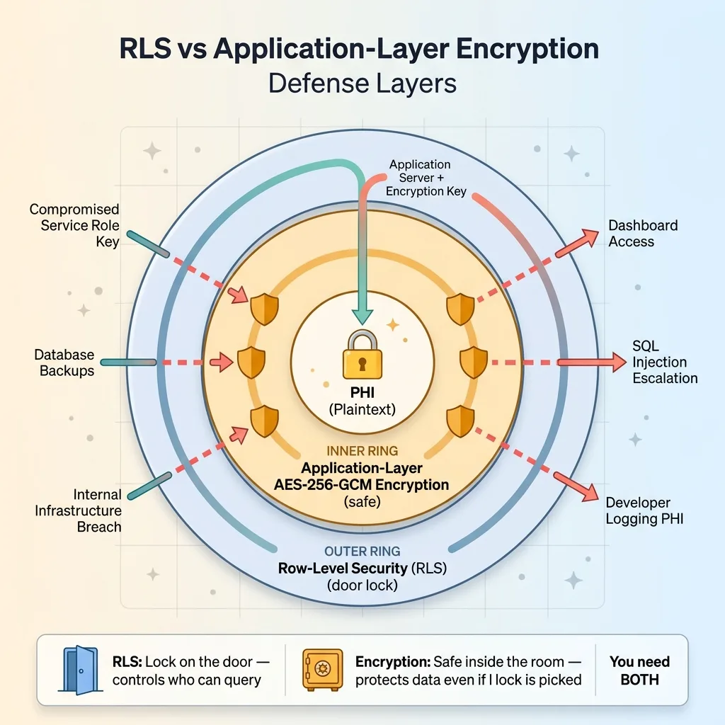 Here's the analogy I use: RLS is the lock on the door. Application-layer encryption is the safe inside the room. If someone picks the lock — or has a master key — RLS is defeated. But the safe still holds. You want both.